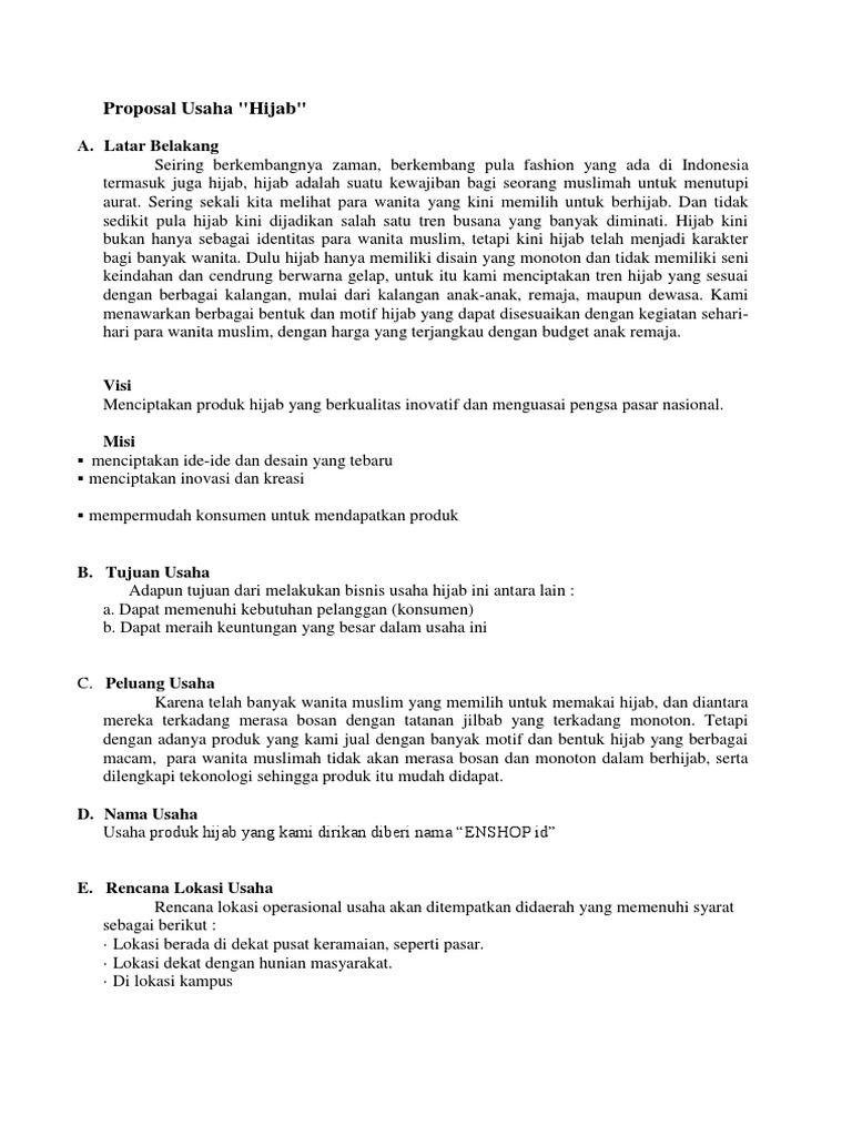 Proposal Bisnis Pdf Document from static.dokumen.tech Feb 11, 2016 · dari proposal usaha ini dapat disimpulkan bahwa membuka usaha penjualan jilbab sangat menguntungkan, memiliki peluang sangat baik dalam jangka waktu yang panjang, mudah untuk dikembangkan, selain itu usaha ini dapat menjaring tenaga kerja untuk mengurangi tingkat pengangguran di indonesia.